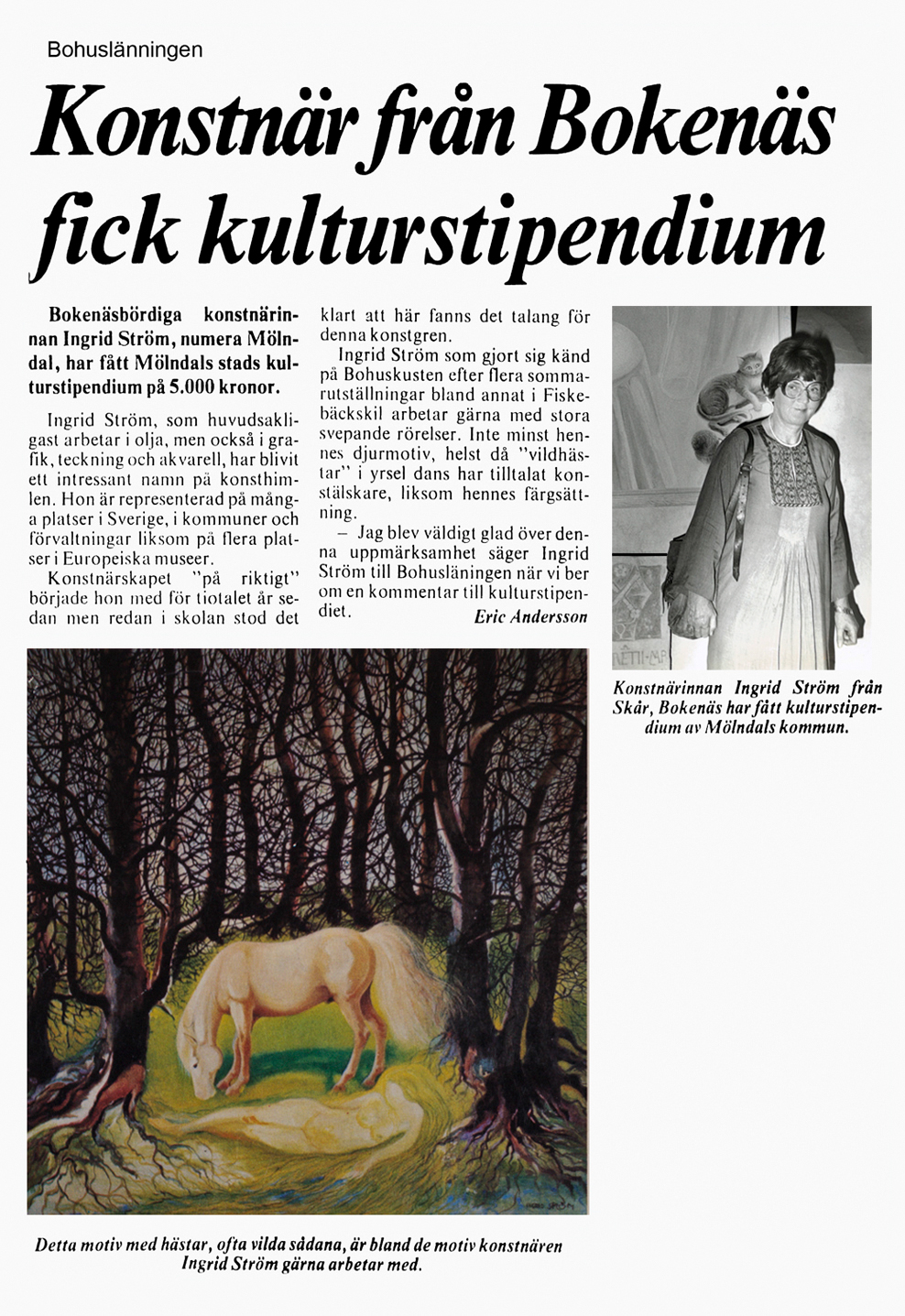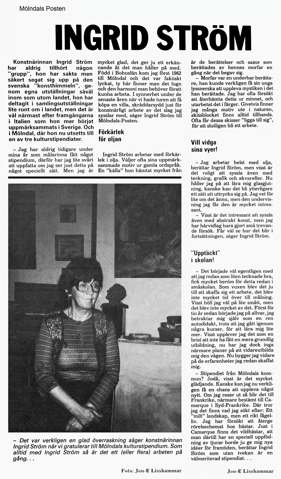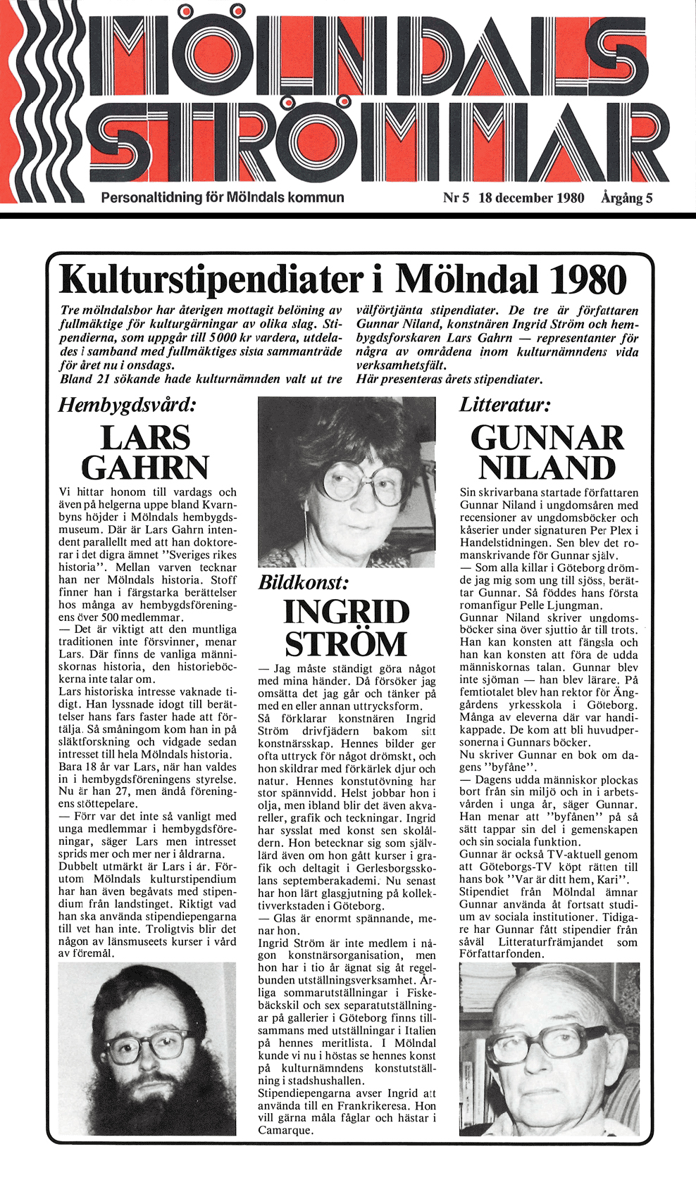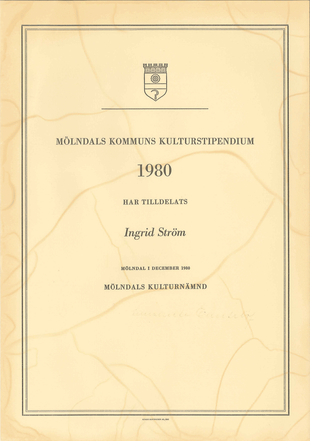 Mölndals Kulturnämnd har beslutat att tilldela Ingrid Ström kommunens kulturstipendium 1980, vilket kommer att överlämnas vid kommunfullmäktiges sammanträde i Fässbergsskolans aula onsdagen den 17 december 1980 kl. 18.00