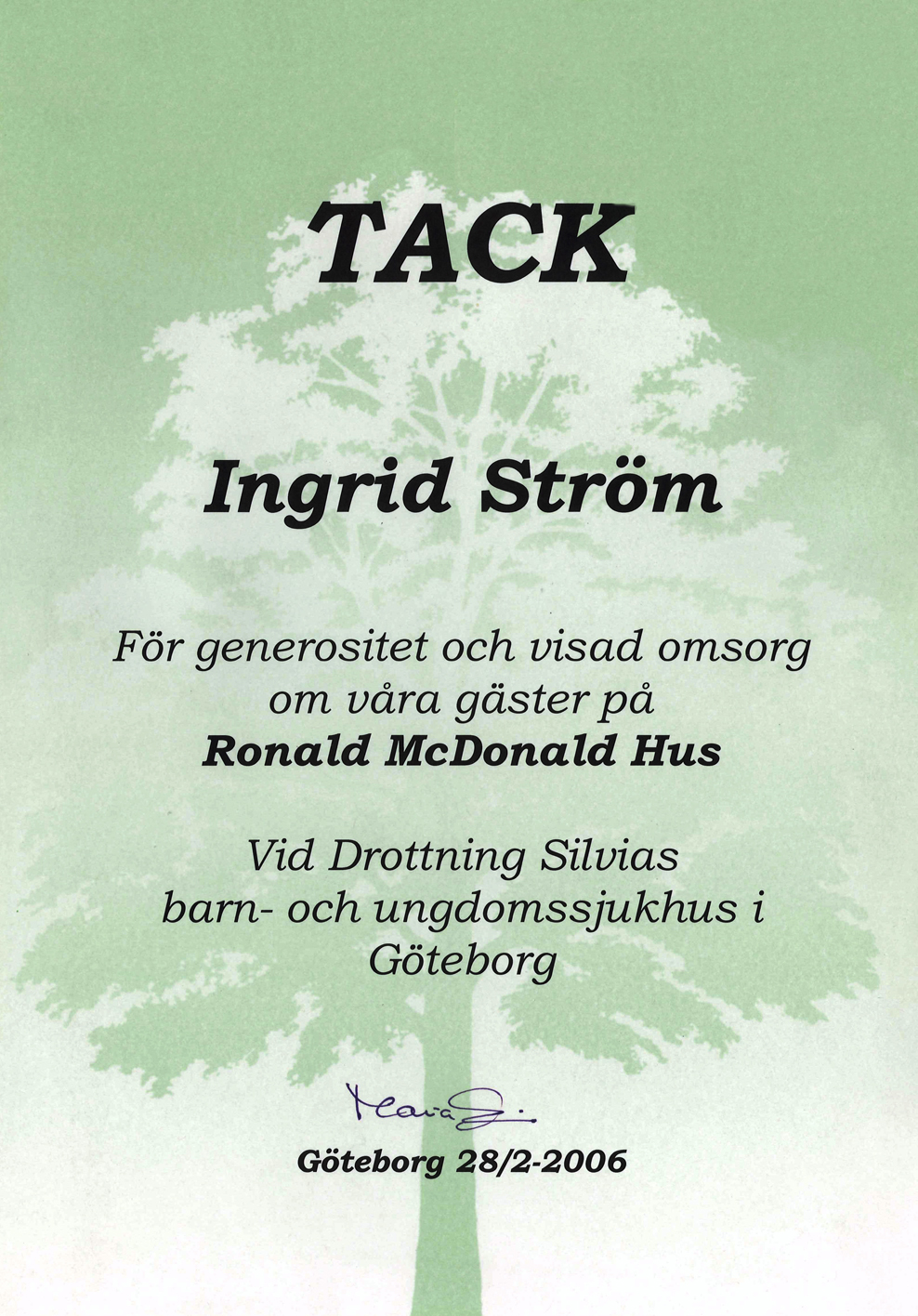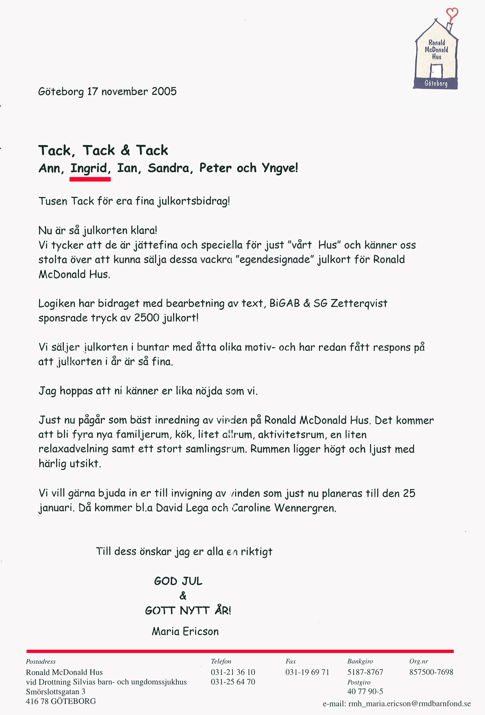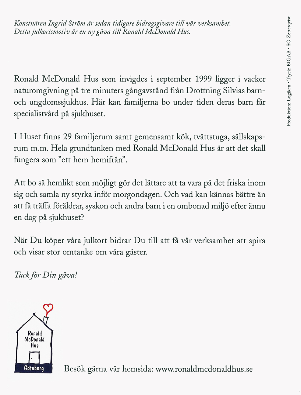 Nedan, angående julkortsmotiv som Ingrid Ström skänkte till Ronald McDonald Hus 2006.